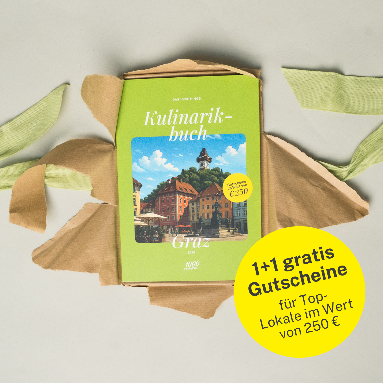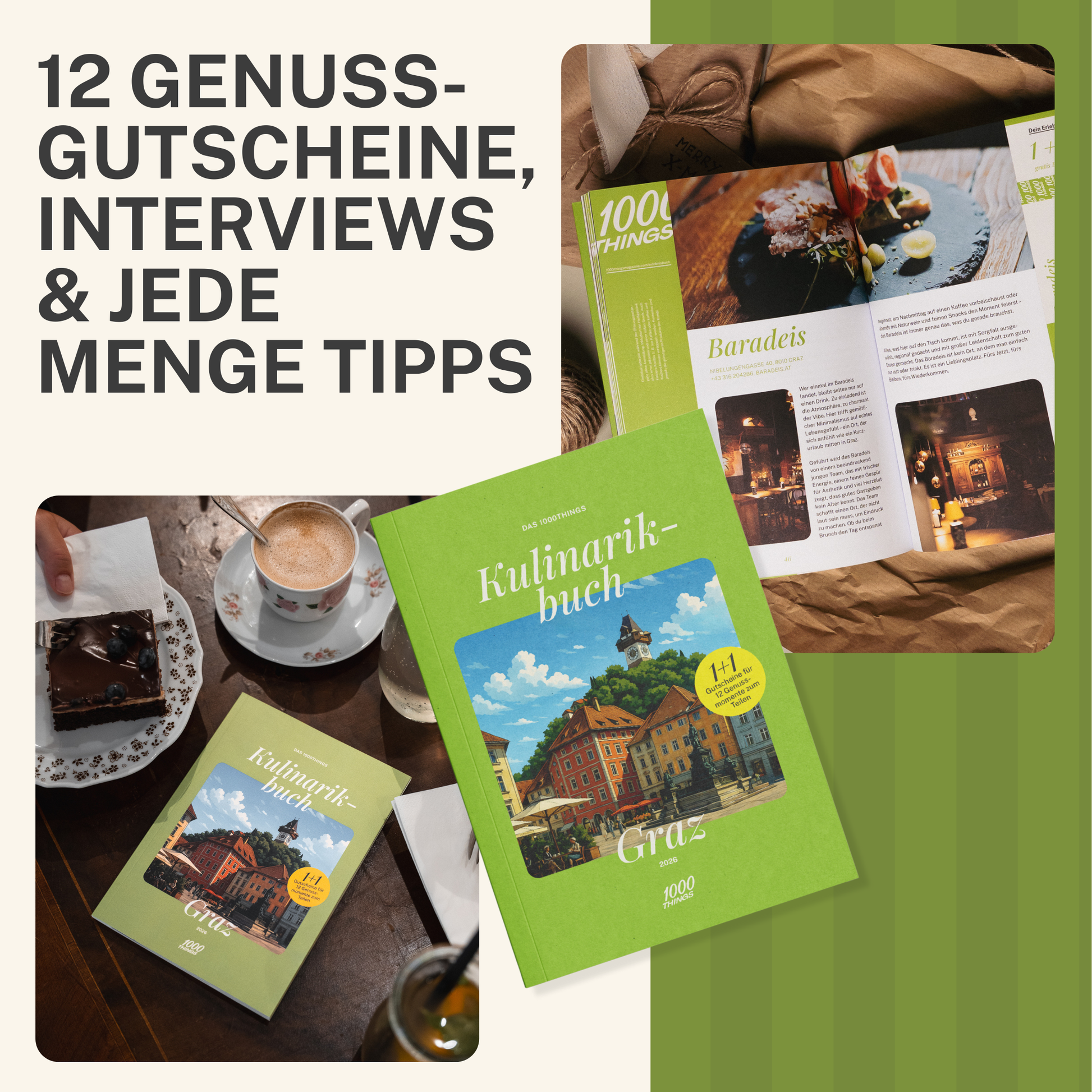 Für alle, die ihre Stadt nicht nur neu erleben, sondern auch völlig neu erschmecken möchten: Das 1000things Kulinarikbuch zeigt Graz von seiner köstlichsten Seite – von Locals kuratiert und voller kulinarischer Geheimtipps.